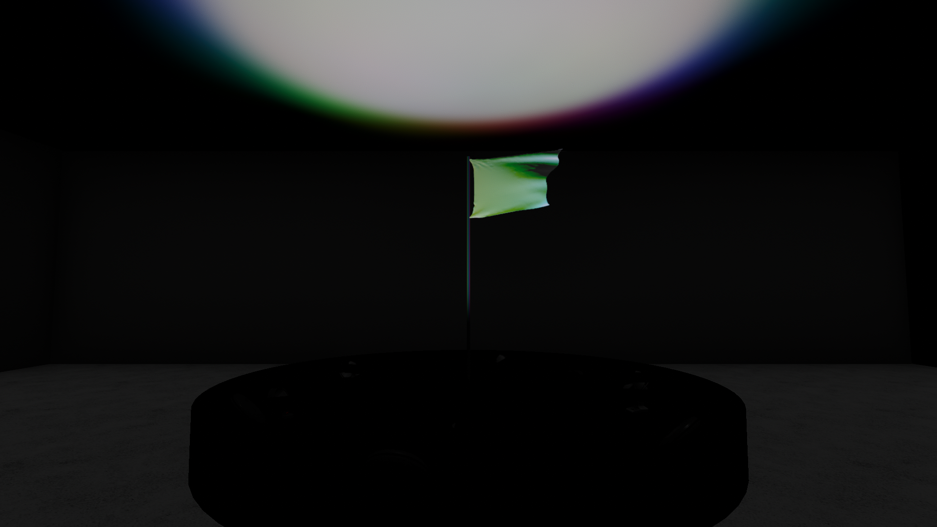 The flag moves and waves in a controlled circular pattern. This pattern is occasionally interrupted with quick wind speed and direction changes, punctuating the meditative circular explorations with sharp bursts of formal contrast and color changes.